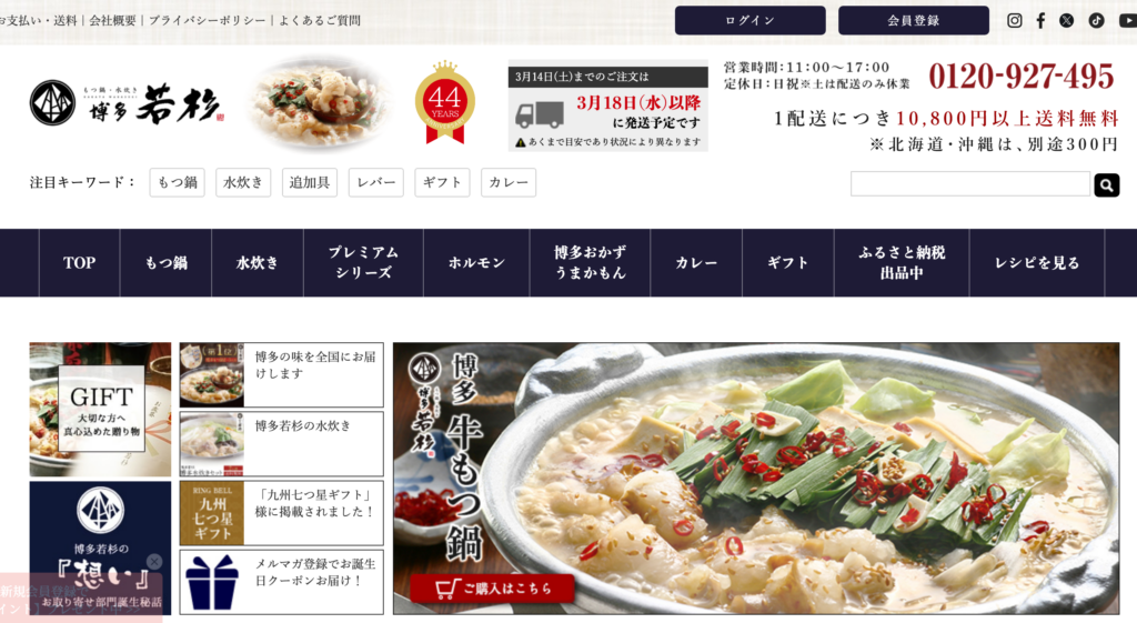 博多若杉は、通販もつ鍋の中でも特に人気が高い専門店の一つで、楽天市場などの大手通販サイトでも高評価レビューを多数獲得している実力派ブランドです。自宅にいながら本格的な博多もつ鍋を楽しめるセット商品が充実しており、コストパフォーマンスの高さと味の良さで多くのリピーターを獲得しています。