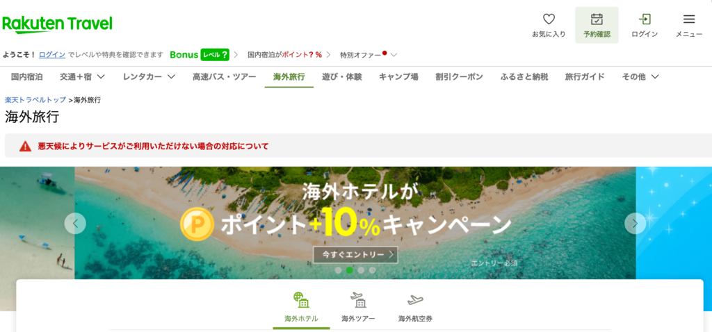 楽天トラベルは国内旅行で高い人気を誇る予約サイトですが、海外旅行にも対応しています。最大の特徴は楽天ポイントが貯まる・使える点で、普段から楽天サービスを利用している方にとっては非常にお得です。ホテル予約を中心に利用する人が多く、海外ホテルの掲載数も一定数あります。ただし、海外旅行に特化したサービスではないため、初心者向けのサポートや使いやすさの面ではやや物足りなさを感じる場合もあります。