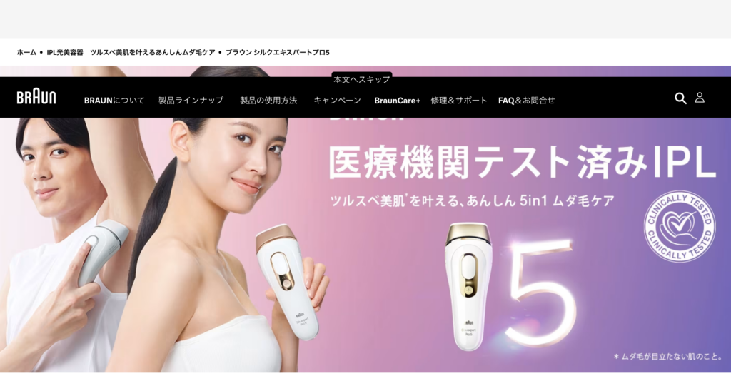 ブラウンのシルクエキスパートPro5は、世界的な家電メーカーが開発した人気の家庭用光美容器です。最大の特徴は、肌の色に合わせて自動で照射パワーを調整する「スキントーンセンサー」を搭載している点です。