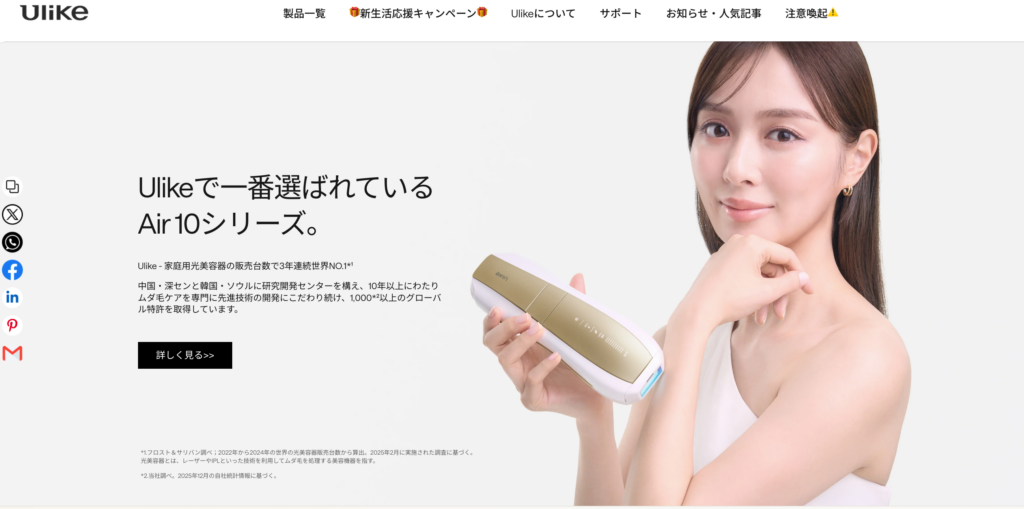 Ulike Air3は、冷却機能を搭載した家庭用光美容器として人気を集めているモデルです。照射時に冷却プレートが肌を冷やす仕組みになっており、一般的な脱毛器よりも痛みを感じにくいのが特徴です。